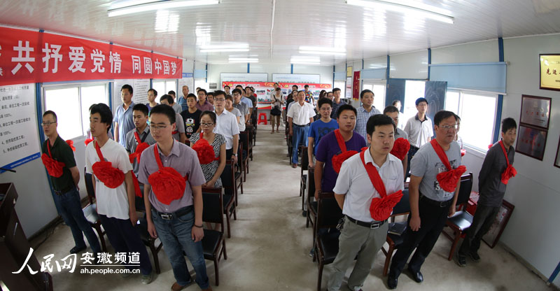 6月27日,在安徽蚌埠市最大的保障房建设工地,中铁四局建筑公司陶山小区项目部40名新老党员齐唱“没有共产党就没有新中国”。