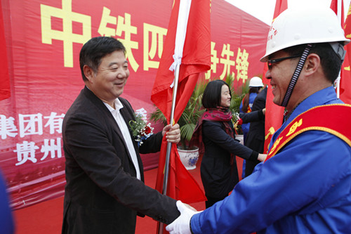 中铁四局董事长、党委纪实张河川(左)在西南片区去党建活动上授旗。焦山摄