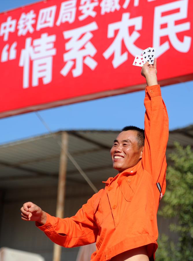 7月2日,中铁四局的一线建设者在演出现场参加互动节目。当日,中铁四局在合肥南环铁路包河梁厂工地举办“情系农民工”文艺演出送工地活动,为炎热天气下坚守在一线的建设者鼓劲,为重点工程建设加油。新华社记者 刘军喜 摄
