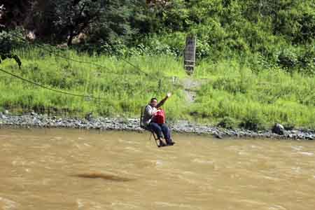 中铁四局二公司承建的梨园左岸应急公路Ⅰ标,全长16.2公里,合同工期为29个月。管段内主要控制工程有“两隧两桥”,即:中村隧道、手扒岩隧道、洛吉河1号中桥、洛吉河2号中桥。线路多位于悬崖峭壁之上、急流陡岩之侧,使得溜索这种原始交通工具派上了“大用场”。