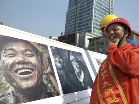 5月4日,中国中铁“十大新型农民工”徐露平观看全国首个农民工主题摄影大赛“农民工我的兄弟姐妹”全国摄影大赛获奖作品展览。本次展出的近200幅作品,多角度、多层面地反映了农民工顽强拼搏的工作场景、艰苦简陋的生活环境、乐观向上的生活态度和勇于奉献的高尚品格。(李晓明)