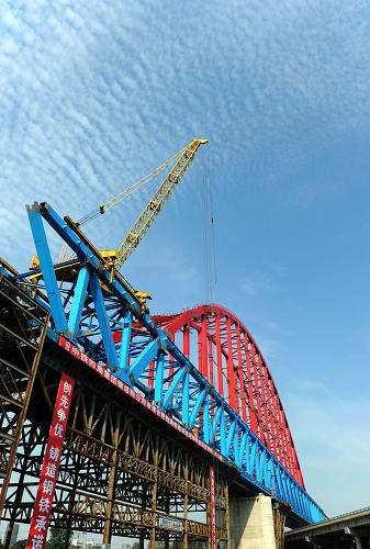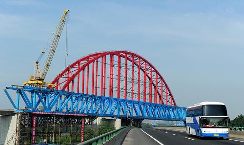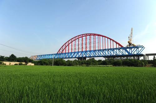 7月9日,跨越合宁高速的南淝河特大桥柔性拱成功合龙。当日,由中铁四局承建的合肥铁路枢纽南淝河钢桁梁柔性拱特大桥柔性拱成功合龙,解决了国内大跨度柔性拱无应力状态下的高精度合龙技术难题。据悉,南淝河特大桥是沪汉蓉快速铁路引入合肥枢纽南环线的重点控制工程,由于大桥需要跨越车流量较大的合宁高速,施工方在钢桁梁架设施工过程中采用多点同步顶推施工工艺,在柔性拱架设施工过程中采用国内首创的“带拱顶推,拱脚合龙”施工方案,确保建设过程中高速公路上车辆行驶安全。新华社记者 刘军喜 摄