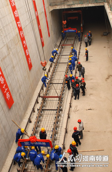 人民网河南频道讯 11月26日10时,在古城郑州新建中原东路地铁站,中铁四局两台巨大的龙门吊将一排长25米轨排从车站口缓缓放入,标志着郑州轨道交通一号线开始铺轨。