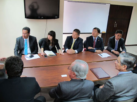 当地时间11月28日,中铁四局董事长、党委书记张河川前往厄瓜多尔乔内水利项目现场办公,并拜见了中国驻厄瓜多尔特命全权大使苑桂森先生,苑大使亲切接见张河川一行,中华人民共和国驻厄瓜多尔经济商务参赞彭涛参加了会面。