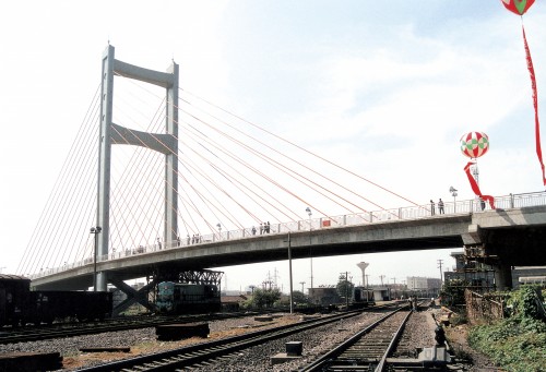 淮北长山路独塔双索面斜拉桥,主塔为哑铃型断面钢管混凝土结构,为国内首例。